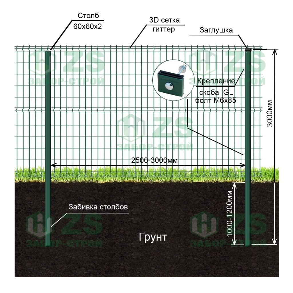 Конструкция забора из 3Д панелей на забивных столбах: