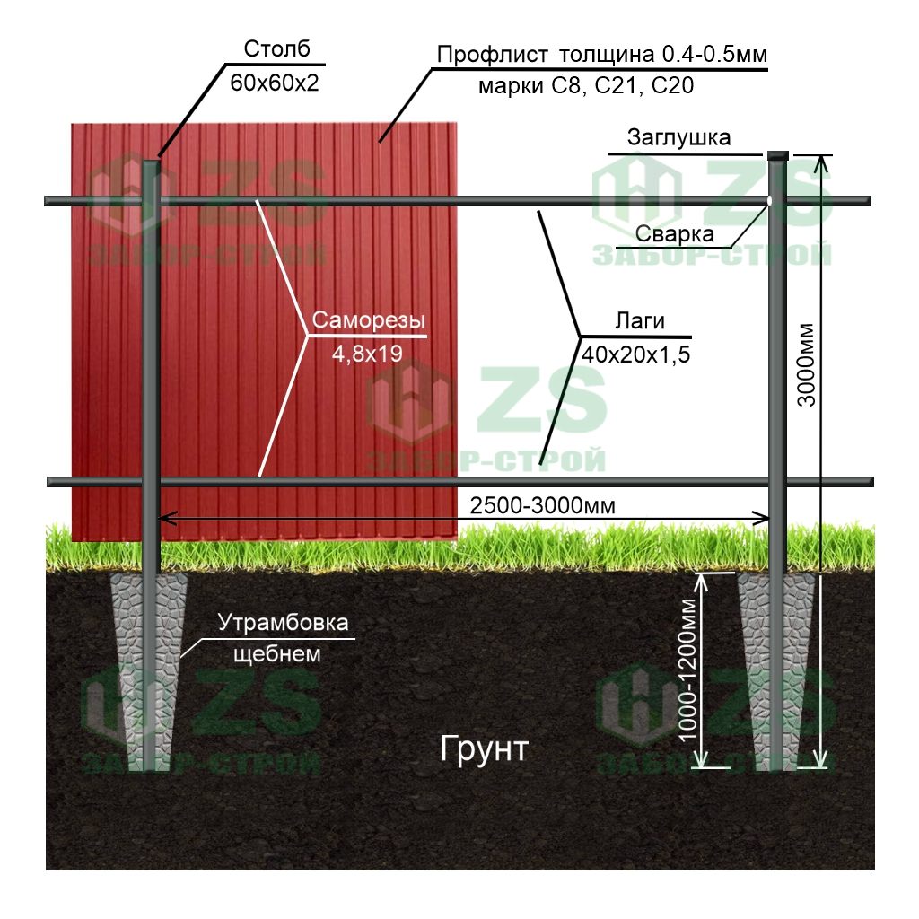 Конструкция забора из профнастила с утрамбовкой щебнем: