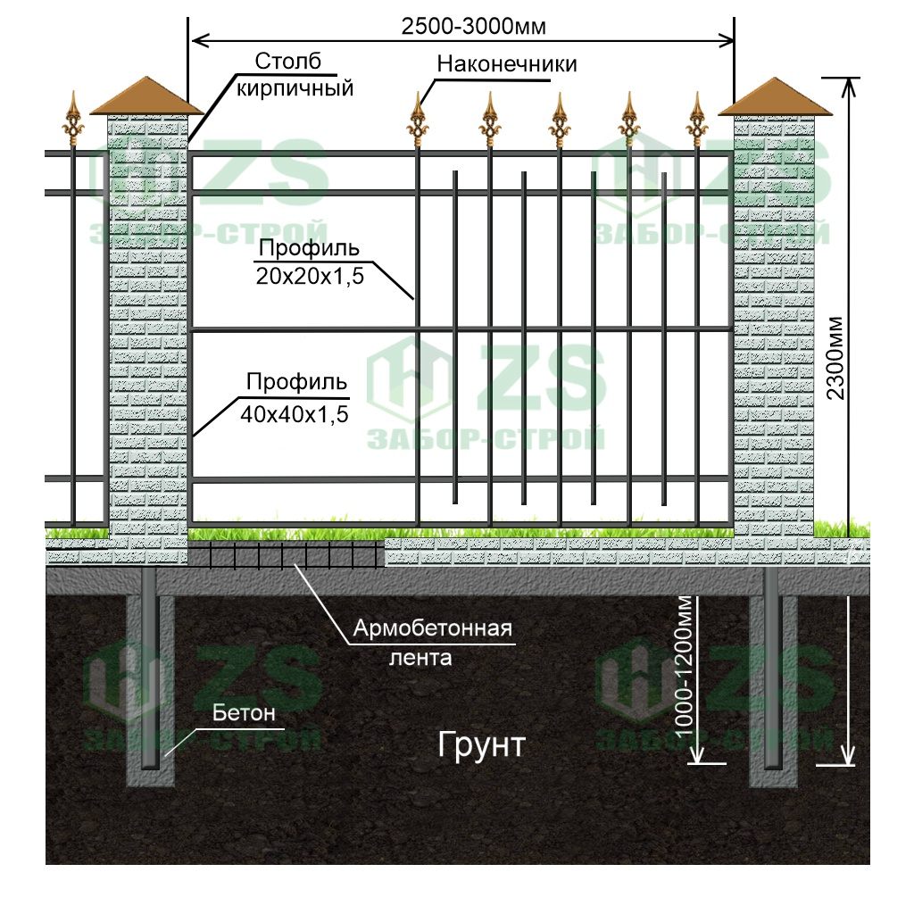 Конструкция сварного забора на ленточном фундаменте с кирпичными столбами: